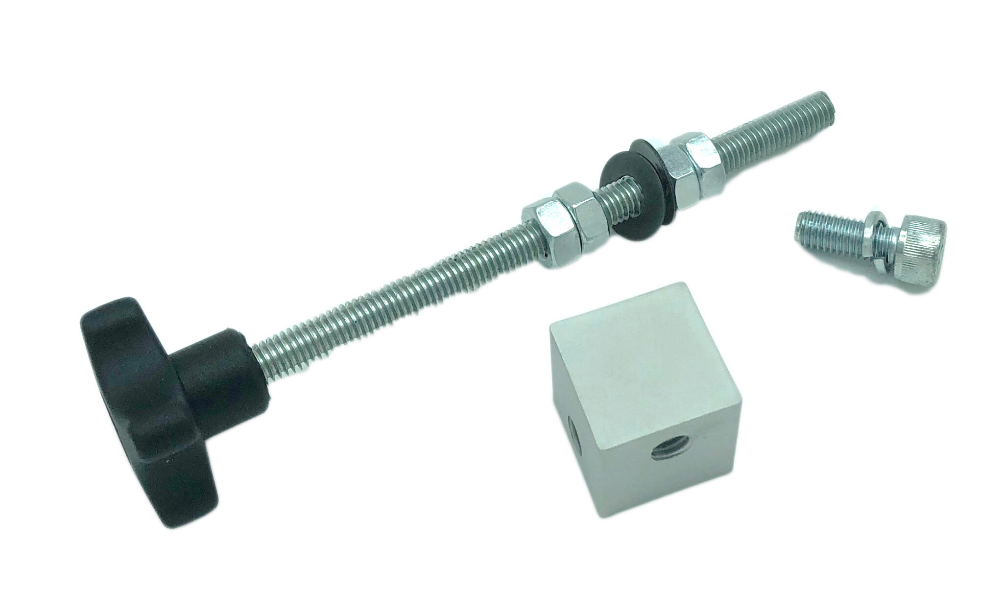 Alle Komponenten für den Austausch der Ausrichtungsstellschraube oben am Excalibur, inklusive Befestigungselemente.
