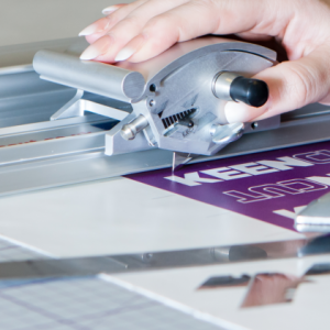 Ein optionaler Aufsatz zum Kaltschneiden von Textilien und anderen empfindlichen Materialien. Ideal zum Trimmen dünner Streifen von Bannern und Plakaten, bei denen eine Messerklinge zu aggressiv wäre.
