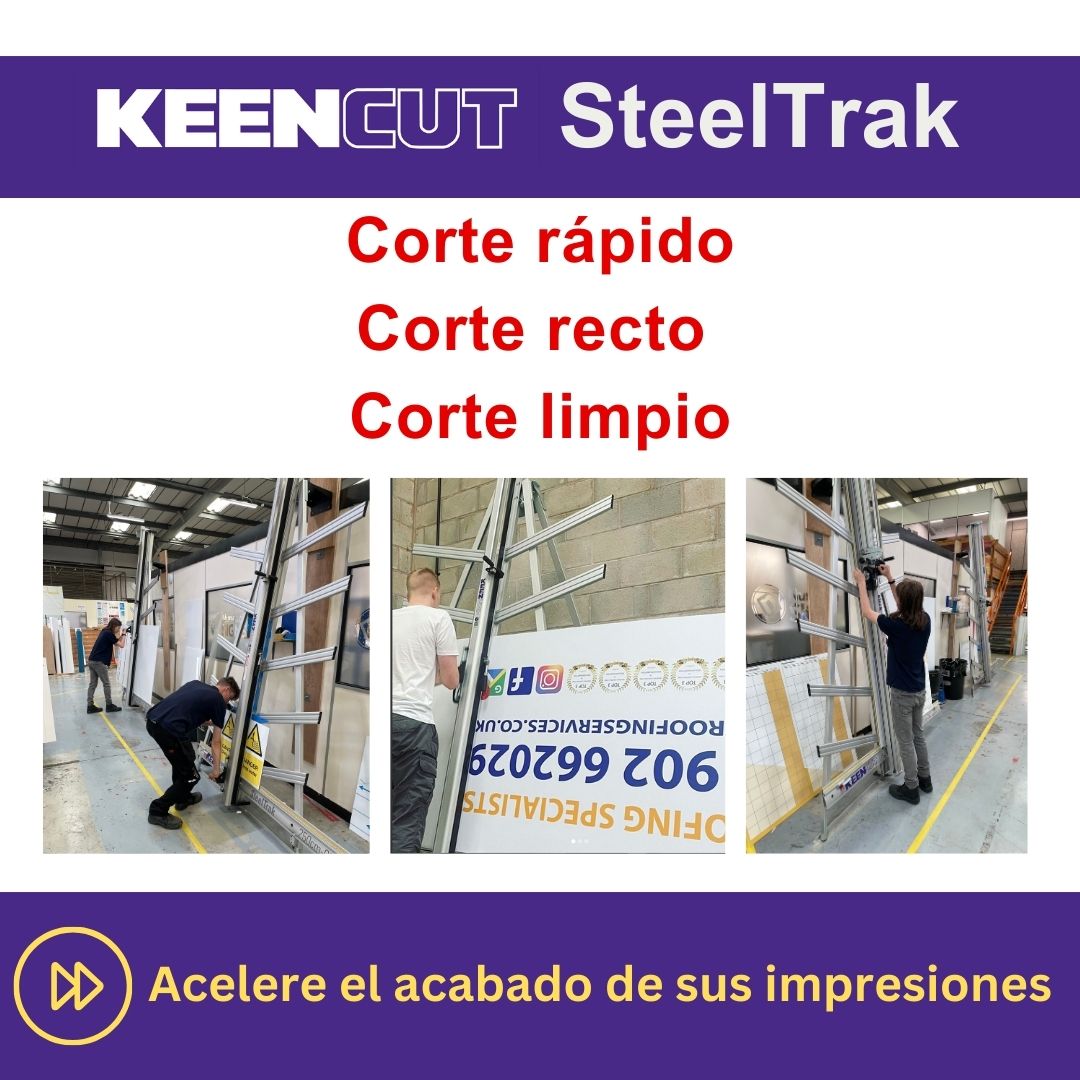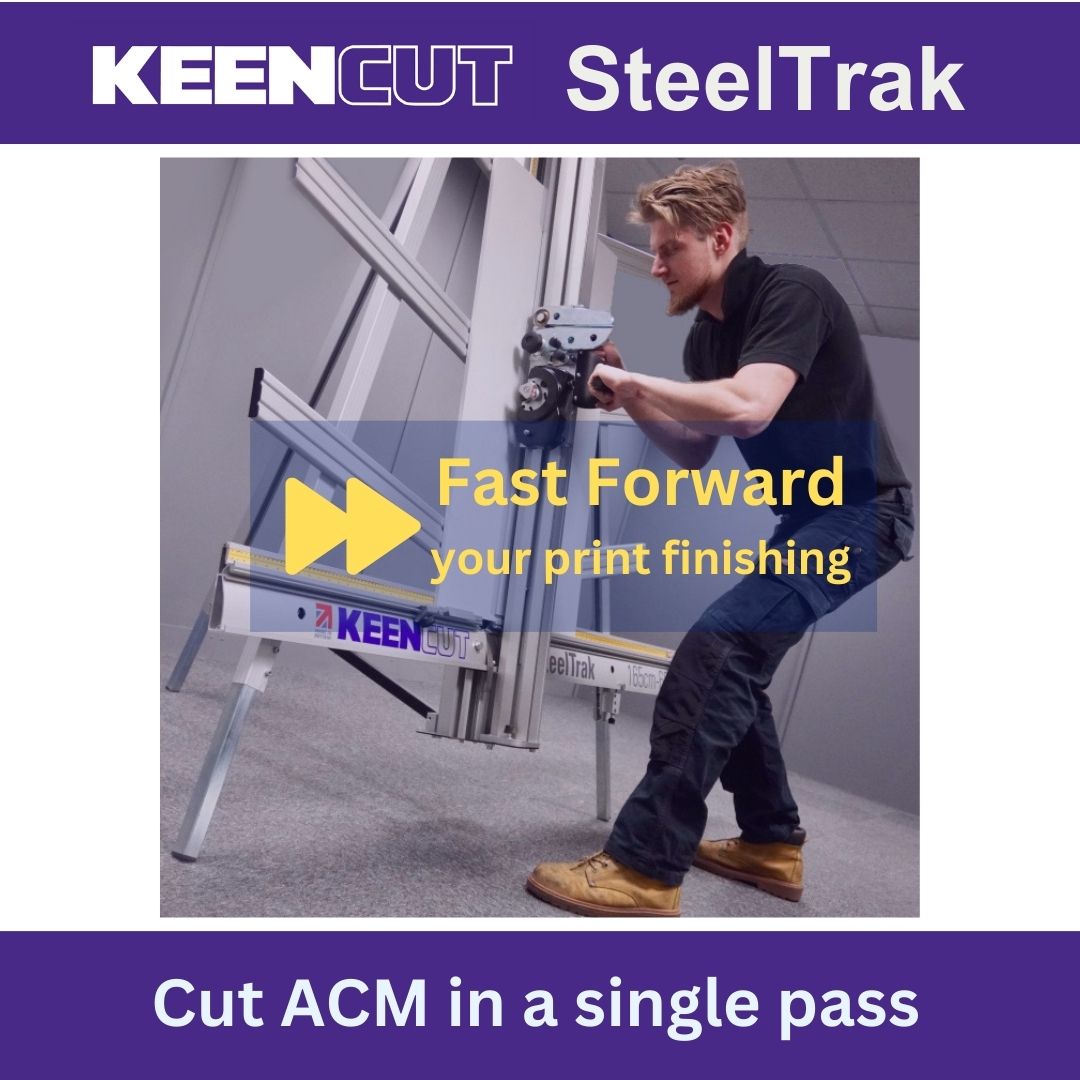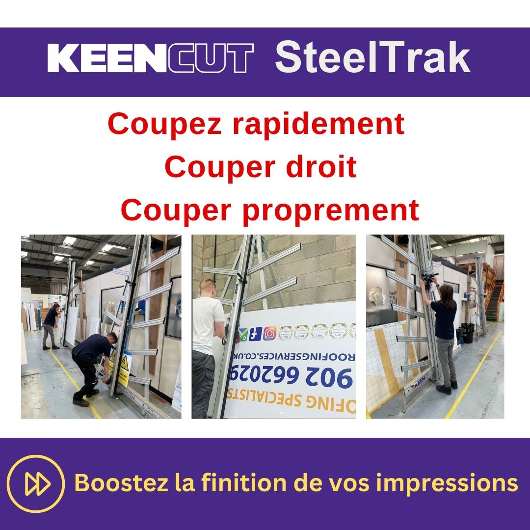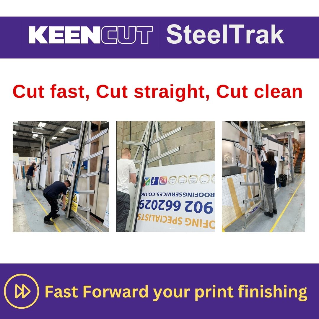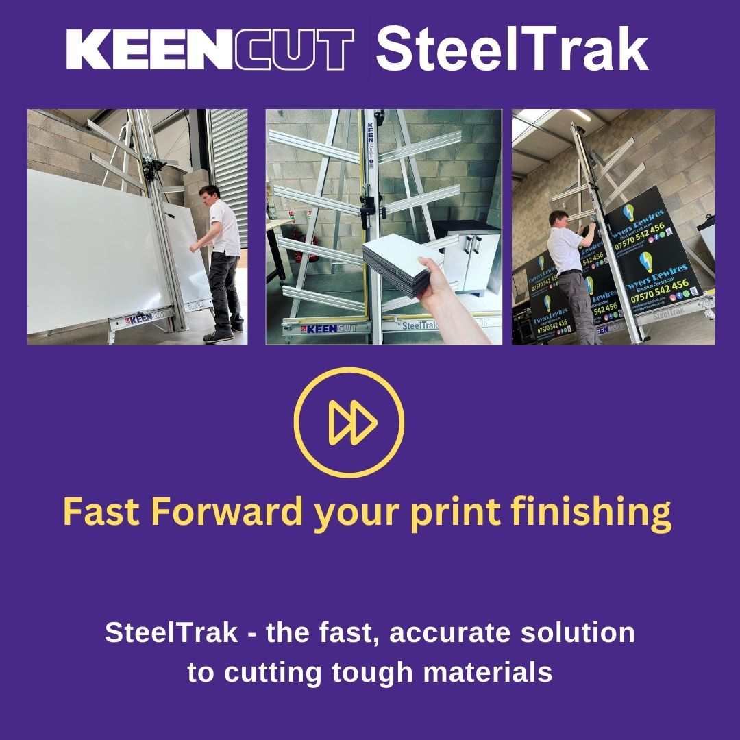 SteelTrak Save money – cut your own Description: With a Keencut SteelTrak in your sign shop, you can buy larger, more cost-effective boards, apply the print to the entire board and then cut it to size.