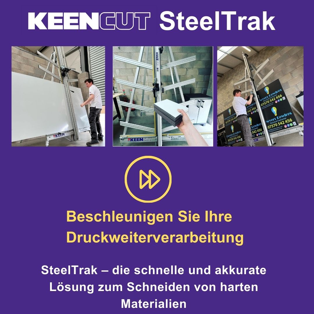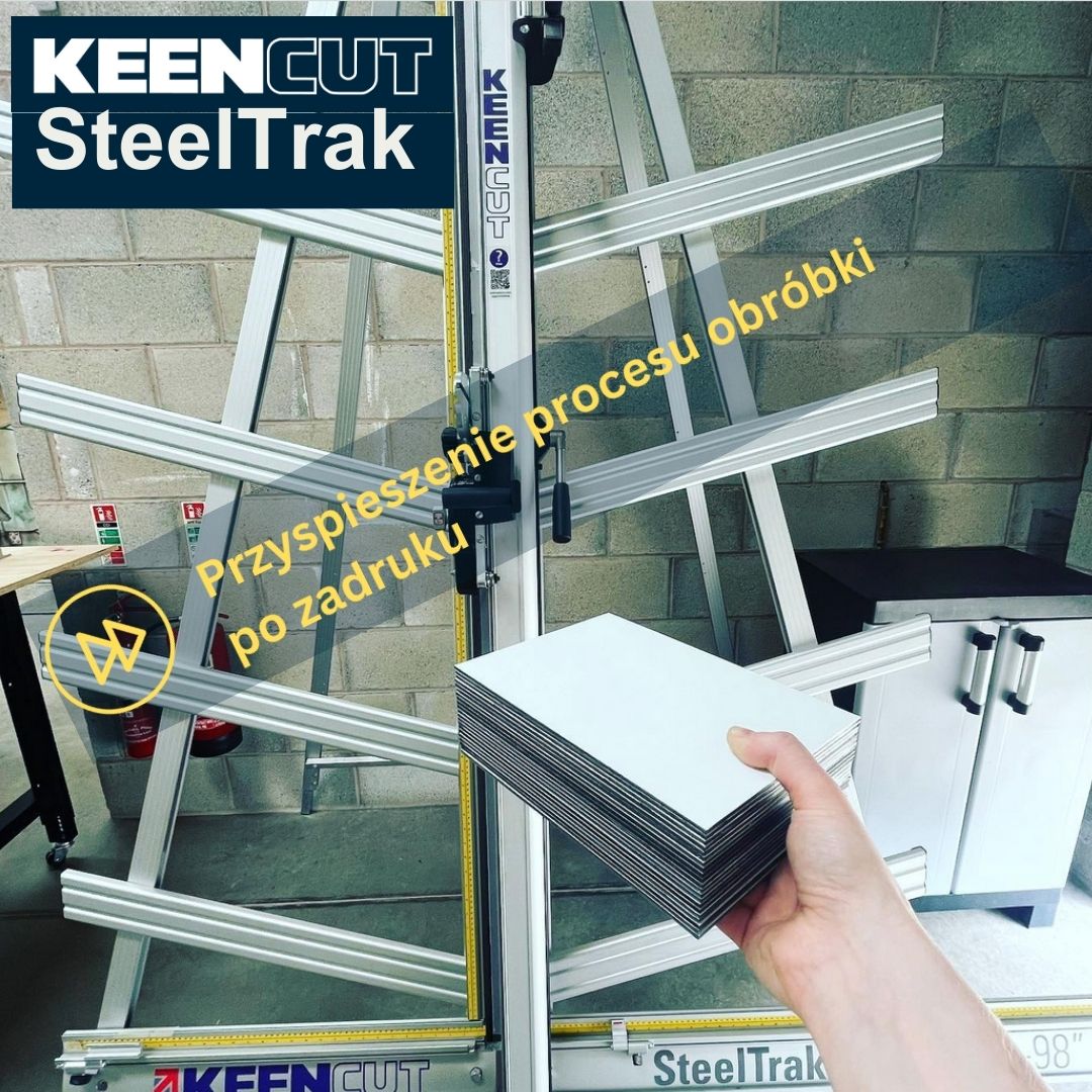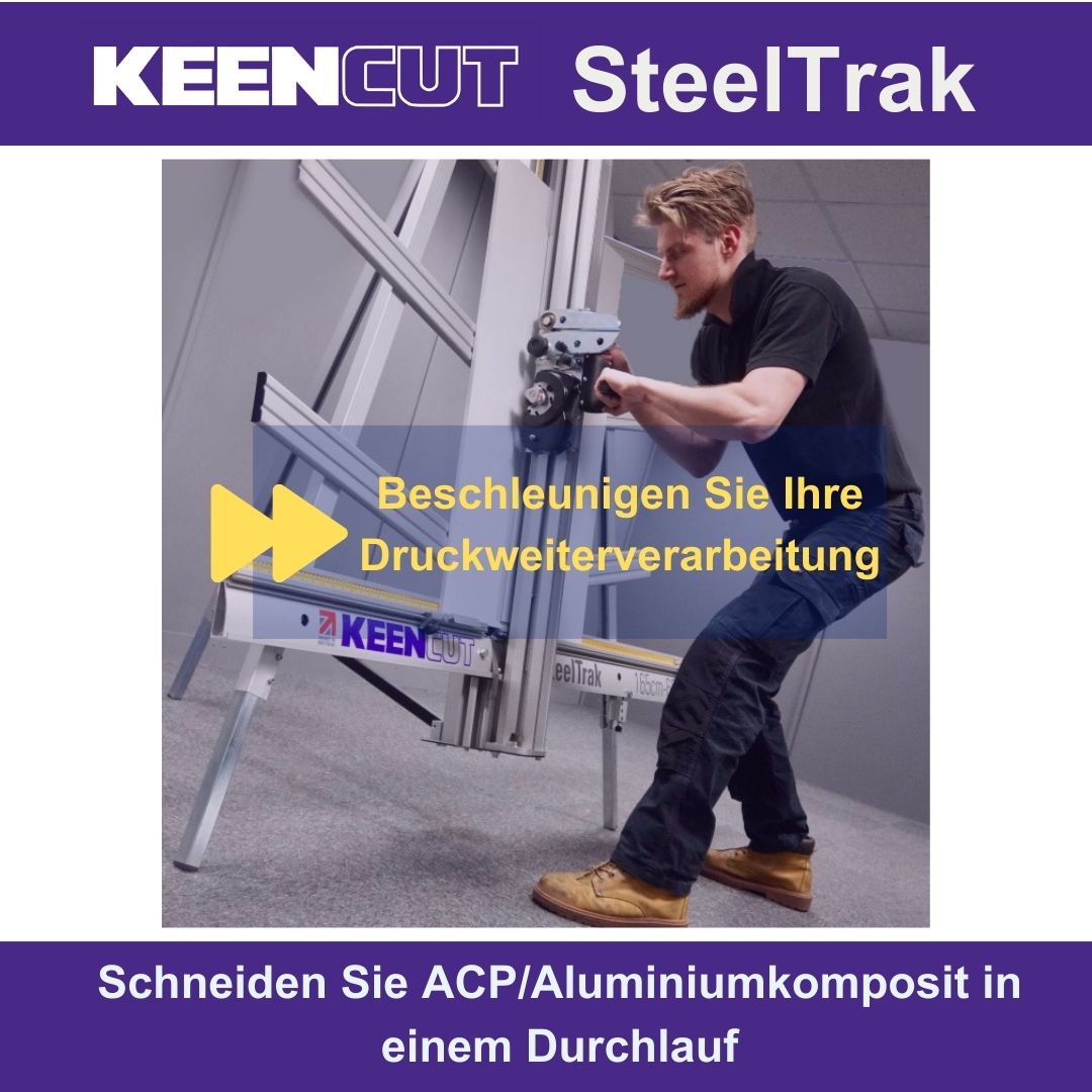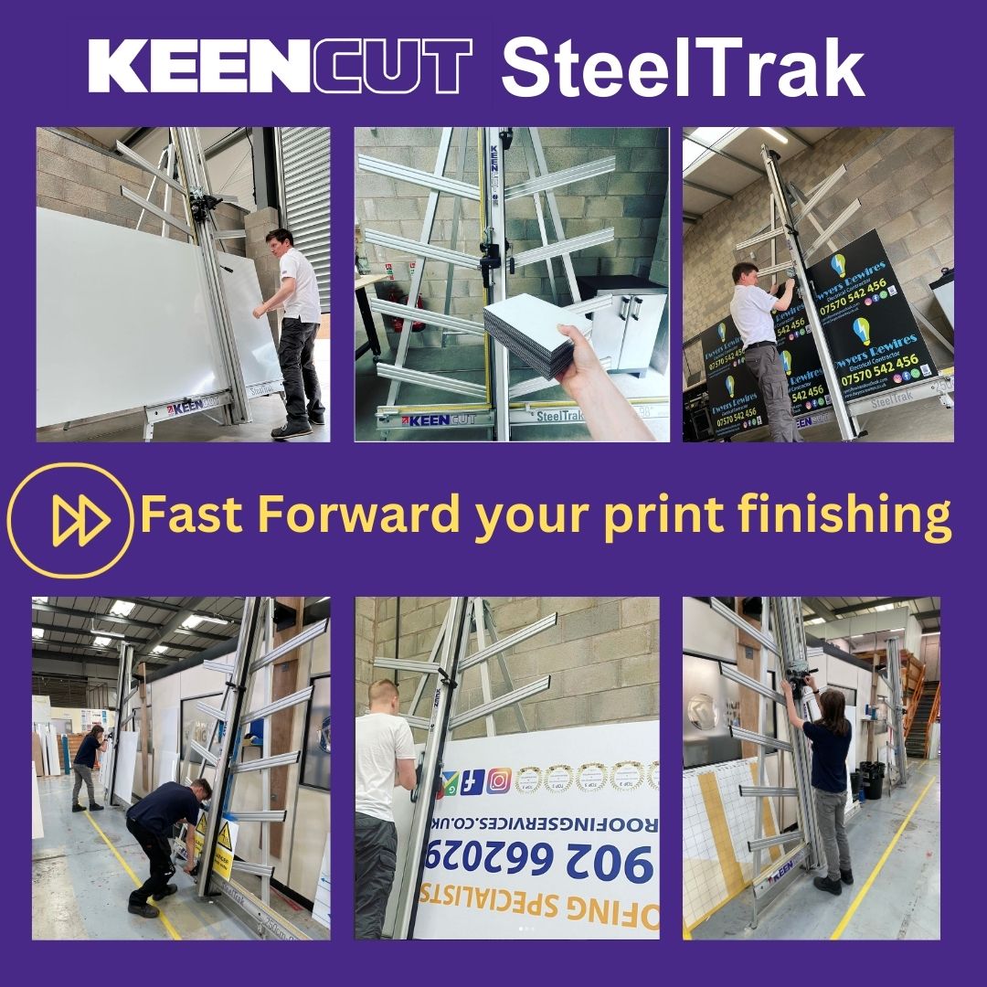 SteelTrak Save money – cut your own Description: With a Keencut SteelTrak in your sign shop, you can buy larger, more cost-effective boards, apply the print to the entire board and then cut it to size.