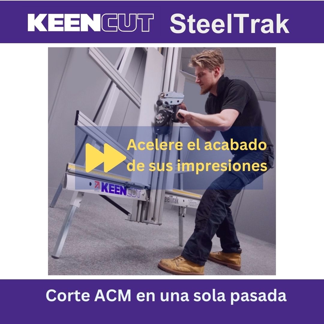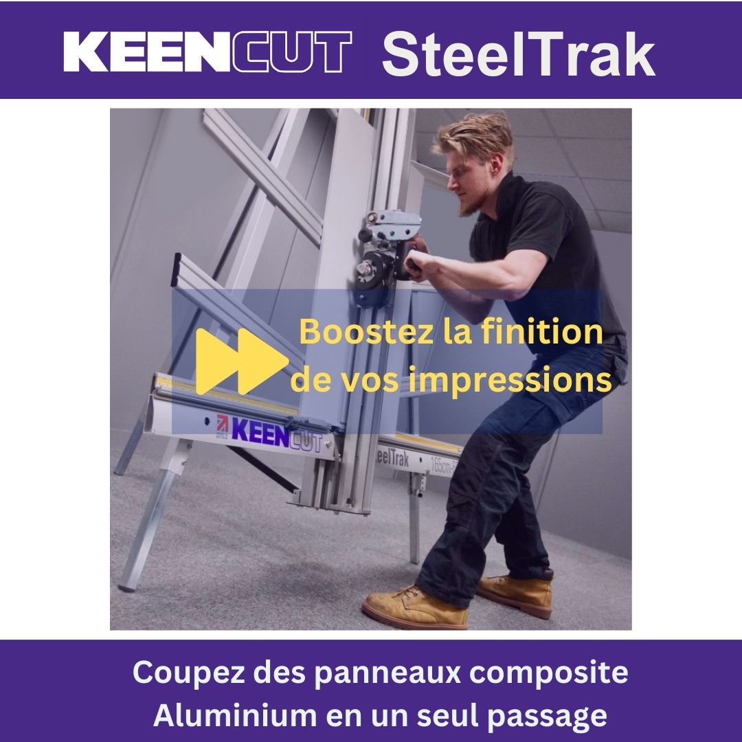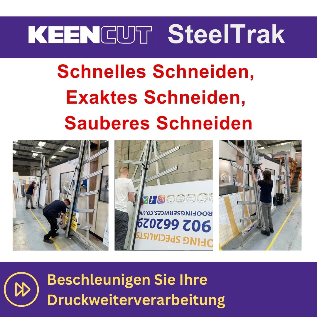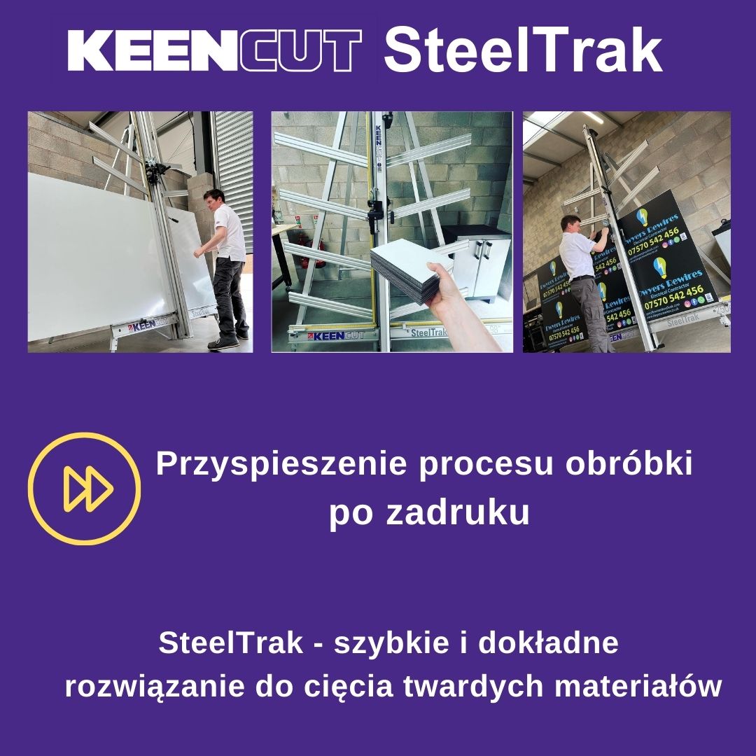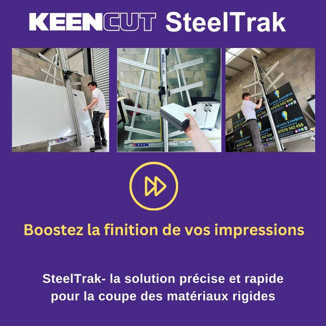 SteelTrak Save money – cut your own Description: With a Keencut SteelTrak in your sign shop, you can buy larger, more cost-effective boards, apply the print to the entire board and then cut it to size.