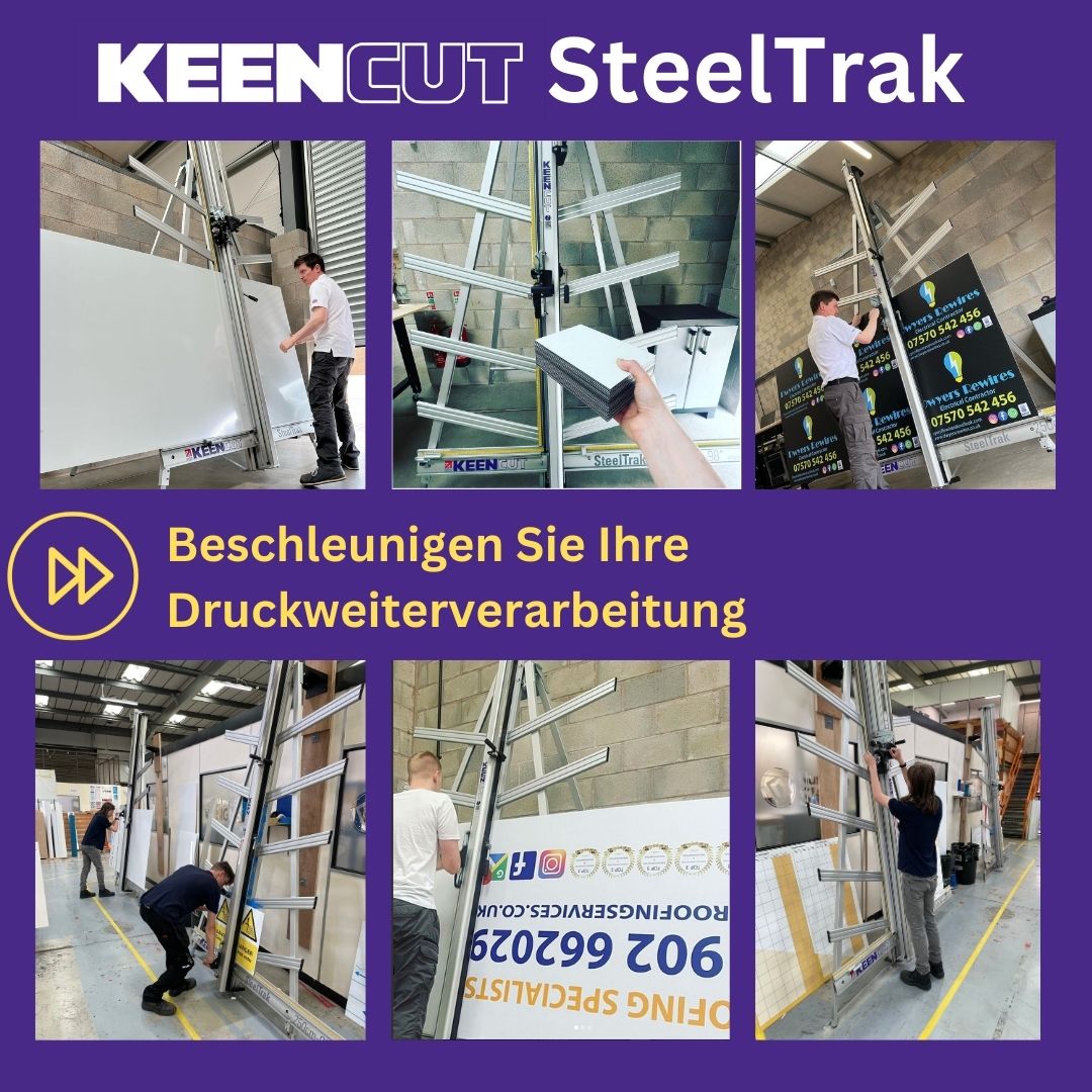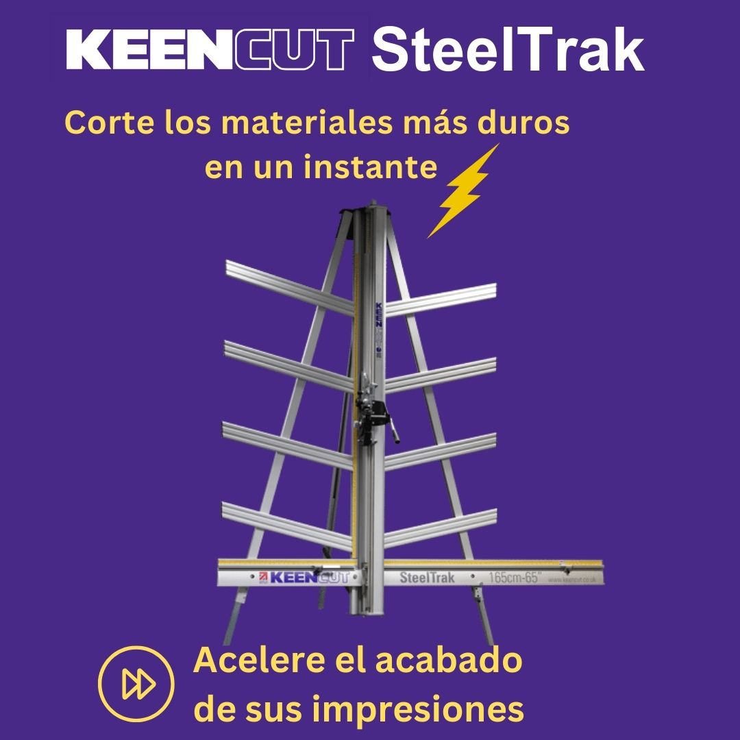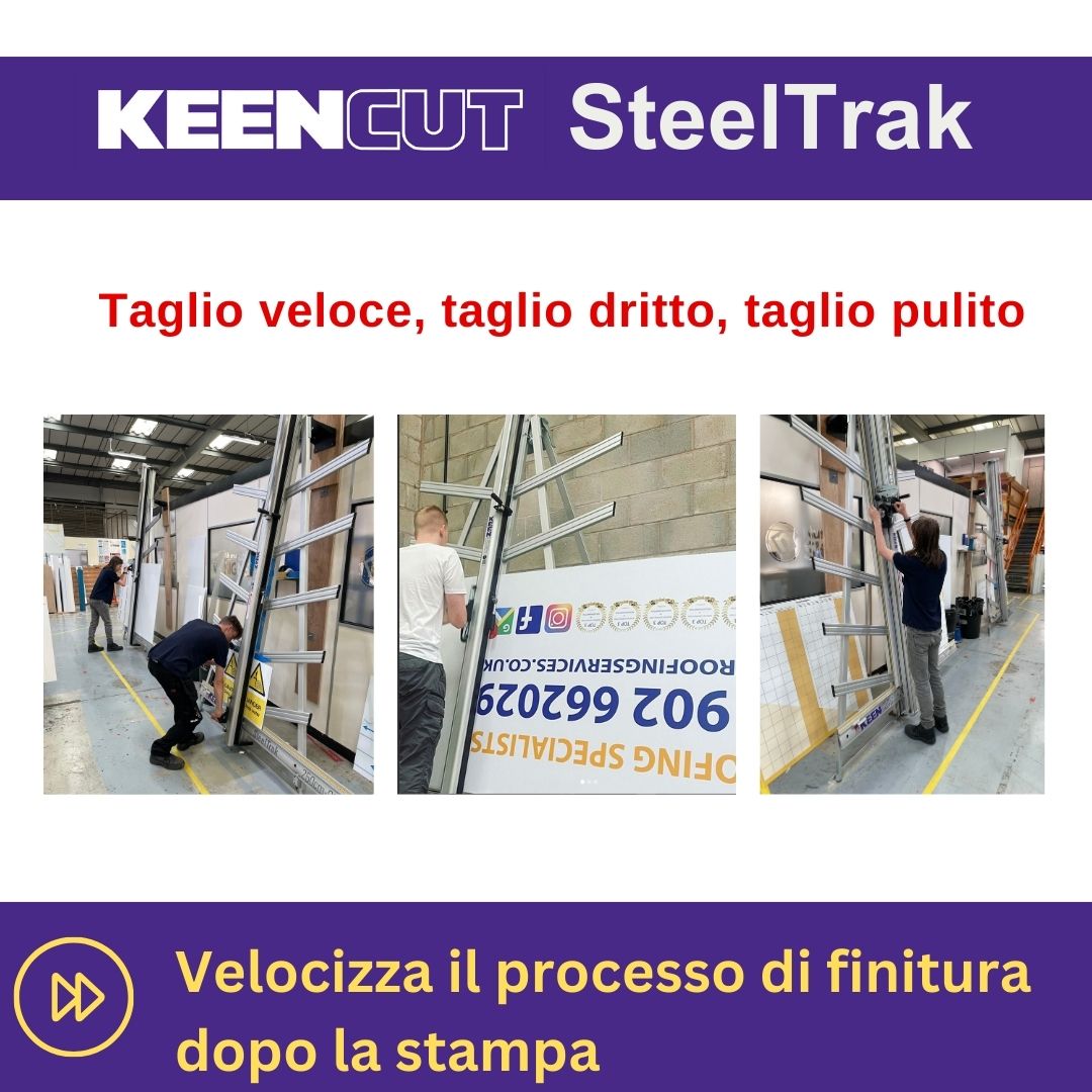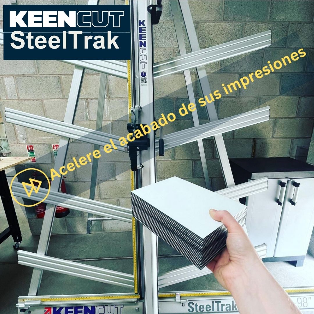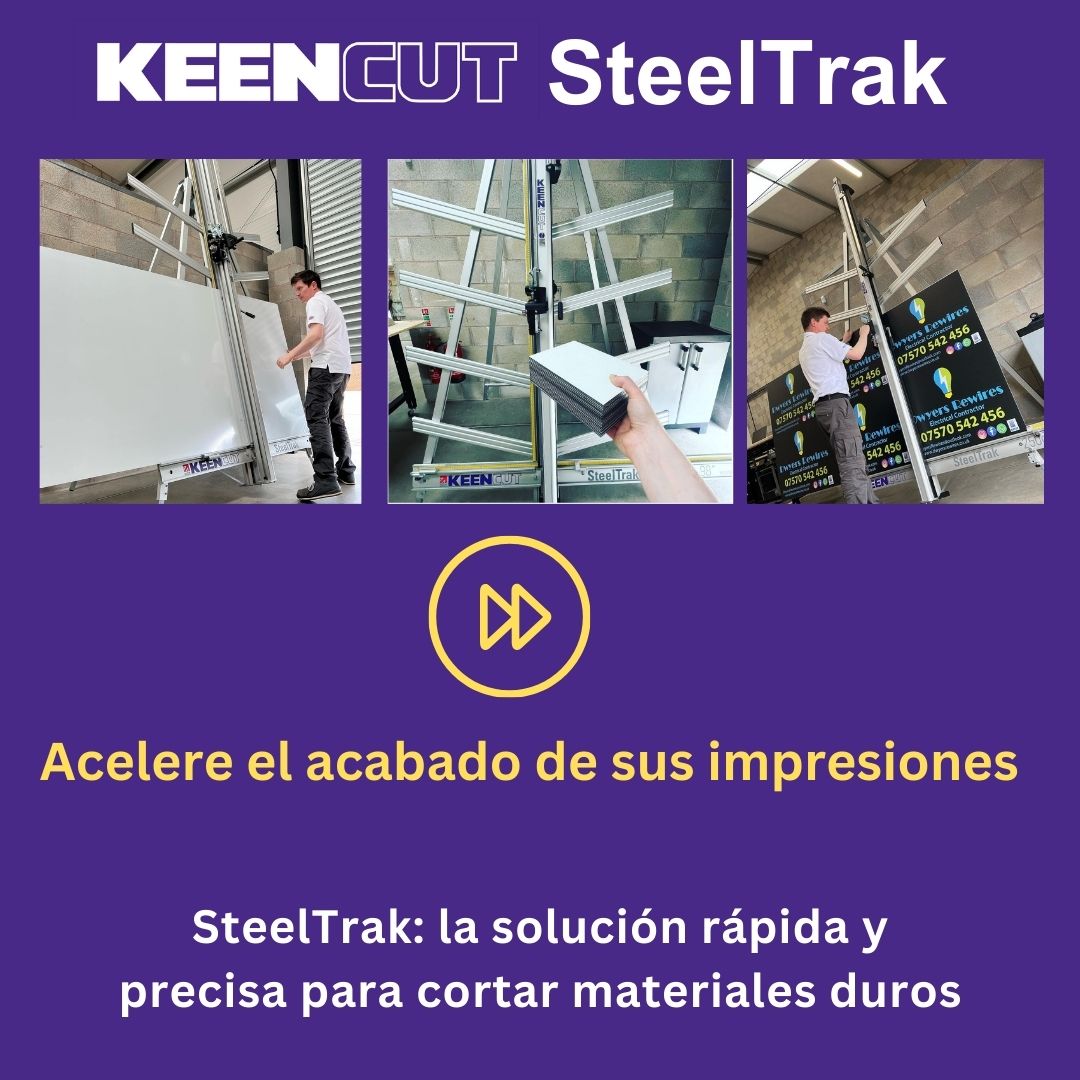 SteelTrak Save money – cut your own Description: With a Keencut SteelTrak in your sign shop, you can buy larger, more cost-effective boards, apply the print to the entire board and then cut it to size.