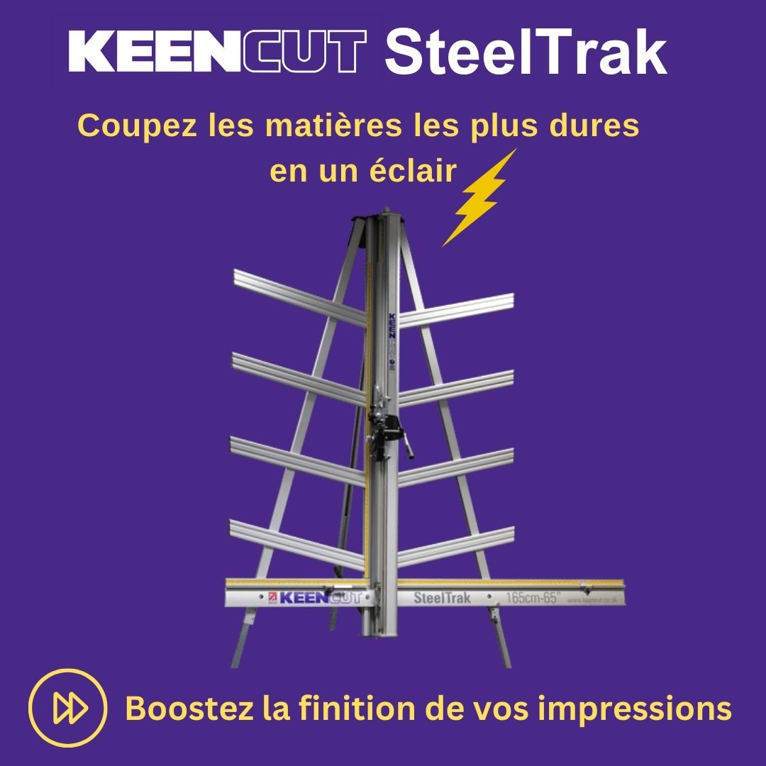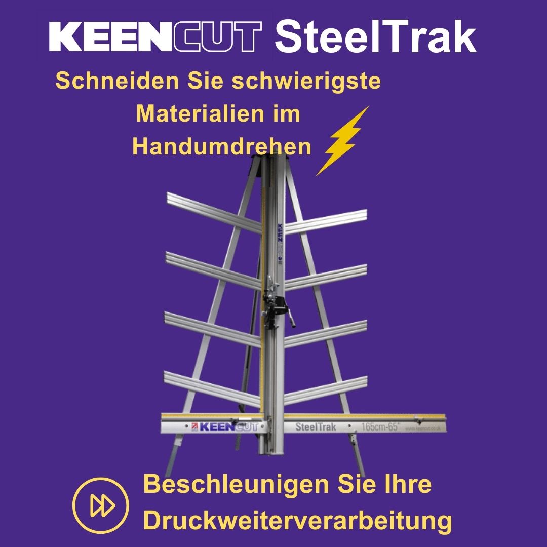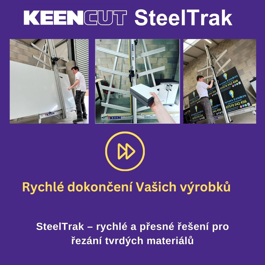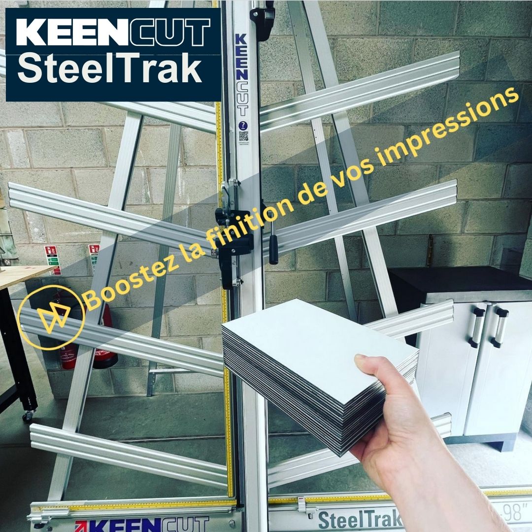 SteelTrak Save money – cut your own Description: With a Keencut SteelTrak in your sign shop, you can buy larger, more cost-effective boards, apply the print to the entire board and then cut it to size.