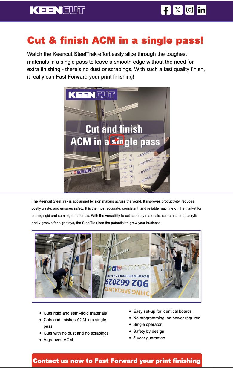 why we recommend the Keencut SteelTrak for ACM cutting Description: 8 reasons a customer should buy a Keencut SteelTrak, from why you need to cut without dust to the importance of repeatable quality, and eliminating all post-cutting curvature.