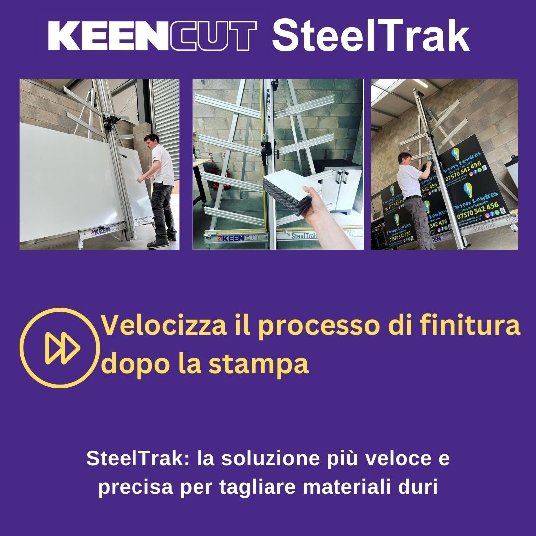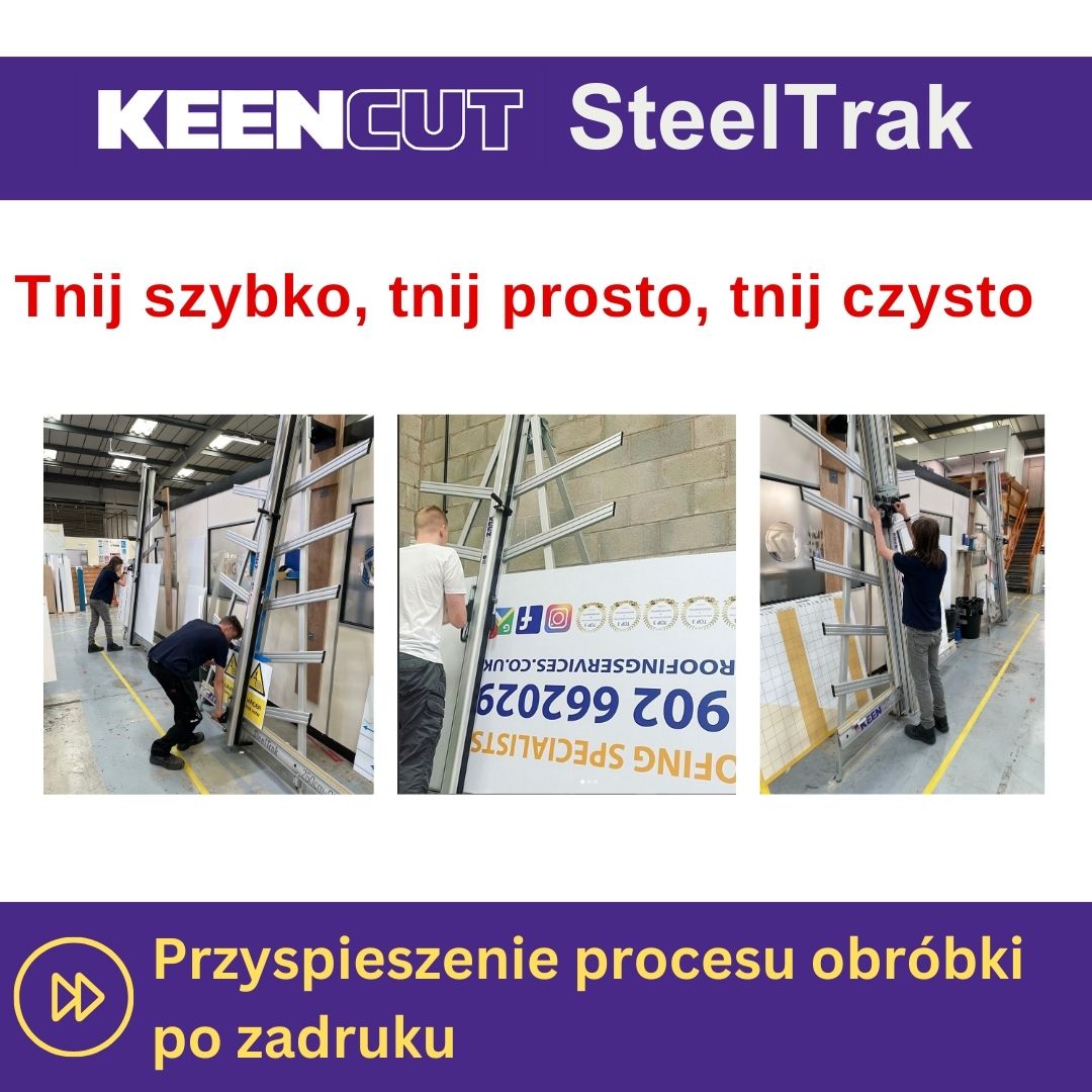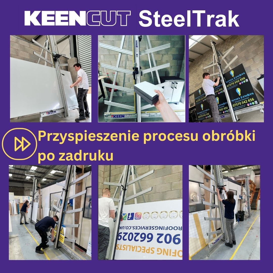 SteelTrak Save money – cut your own ย Description: With a Keencut SteelTrak in your sign shop, you can buy larger, more cost-effective boards, apply the print to the entire board and then cut it to size.
