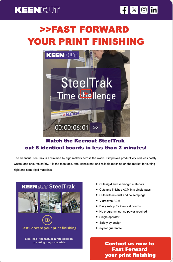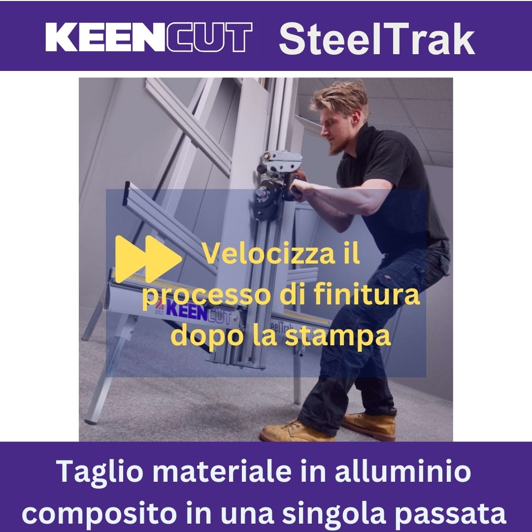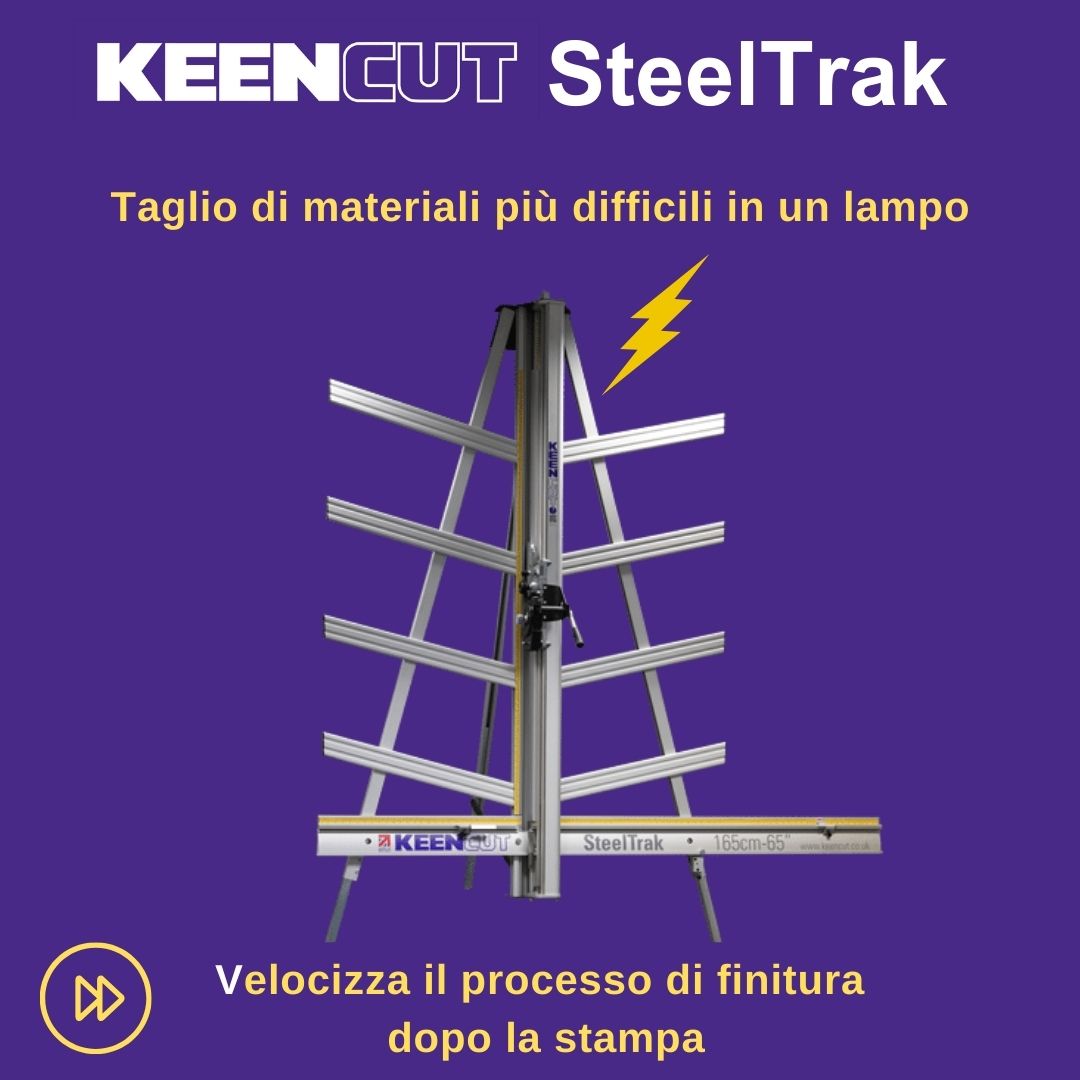 SteelTrak Save money – cut your own ย Description: With a Keencut SteelTrak in your sign shop, you can buy larger, more cost-effective boards, apply the print to the entire board and then cut it to size.