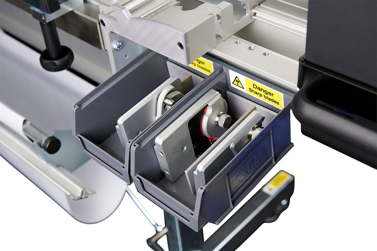 Every feature is for easy and speedy operation. The easy-empty waste catcher lifts off to slide materials into a bin. The cutting heads sit in caddies on the machine, and a fabric bar is immediately to hand to insert for fabric cutting.Â