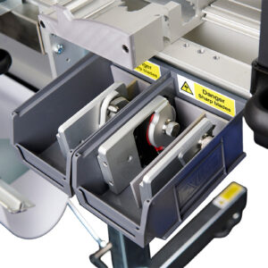 Every feature is for easy and speedy operation. The easy-empty waste catcher lifts off to slide materials into a bin. The cutting heads sit in caddies on the machine, and a fabric bar is immediately to hand to insert for fabric cutting.Â