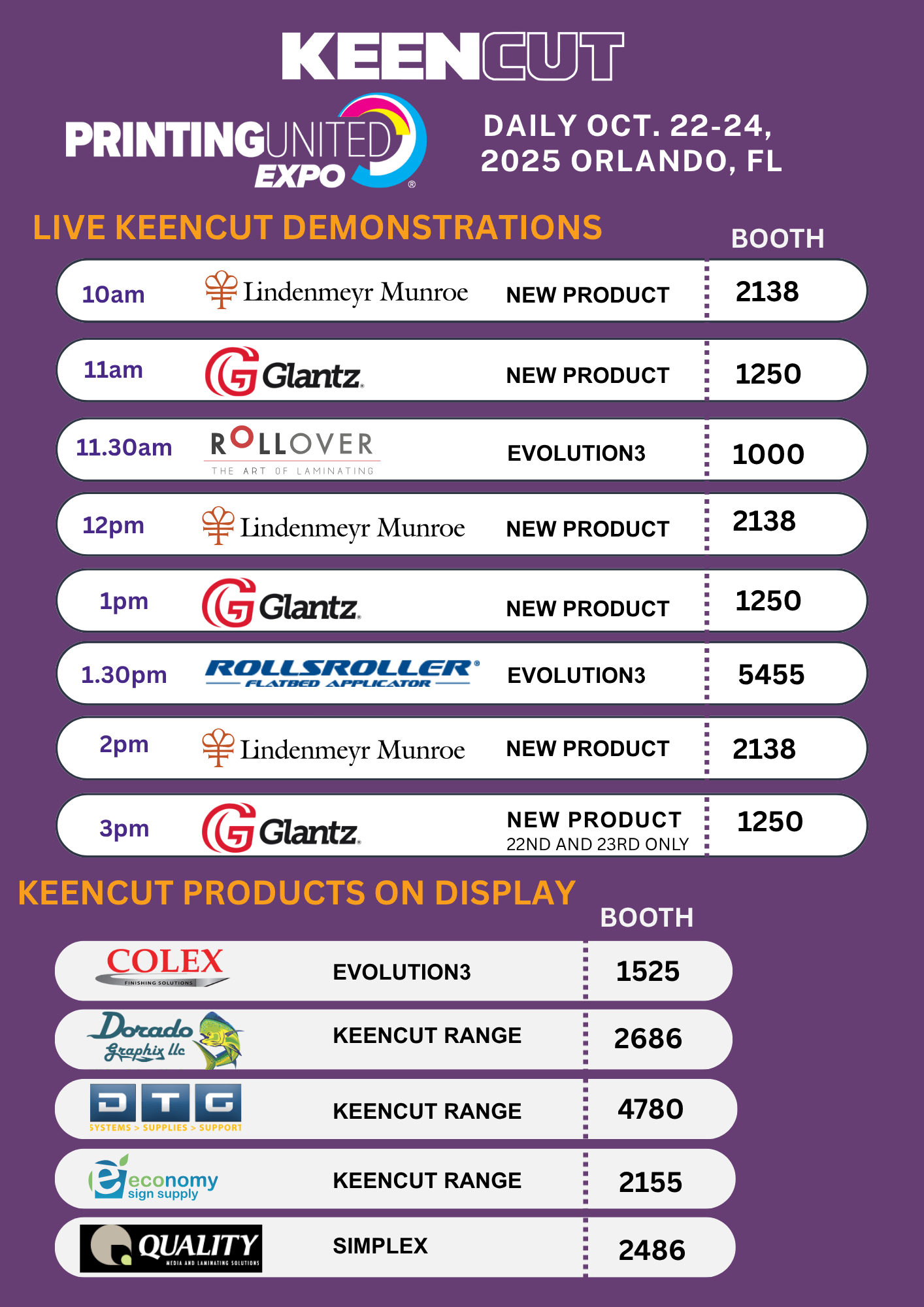 For information, and to try the wider range of Keencut products, you can also visit our expert dealers at Dorado Graphix (Booth 2686), DTG (Booth 4780), and Economy Sign Supply (Booth 2155). QMLS will also be promoting the Keencut Simplex on Booth 2486.