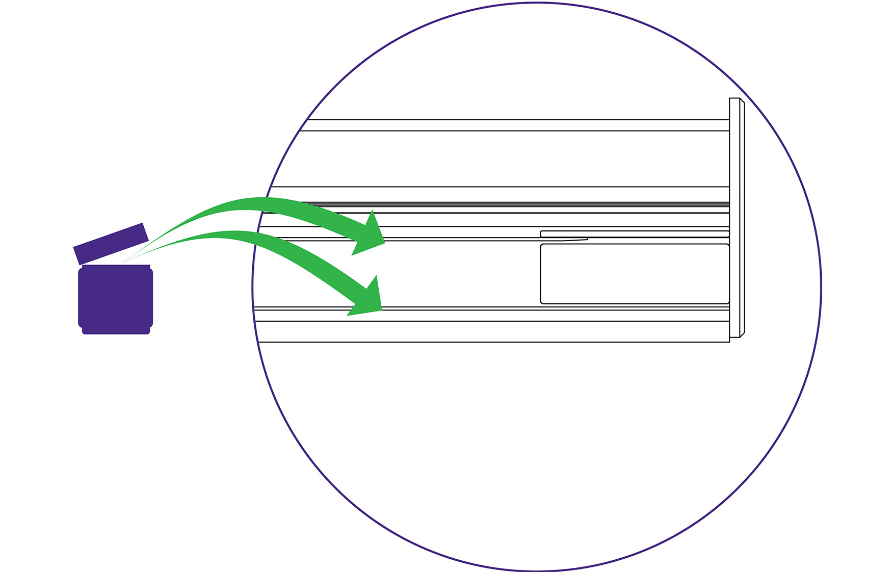 Apply the sightline strip in stages from one end of the cutter bar to the other using the yellow silicone grip as your guide; the back edge of the sightline strip should be touching the front edge of the silicone grip.