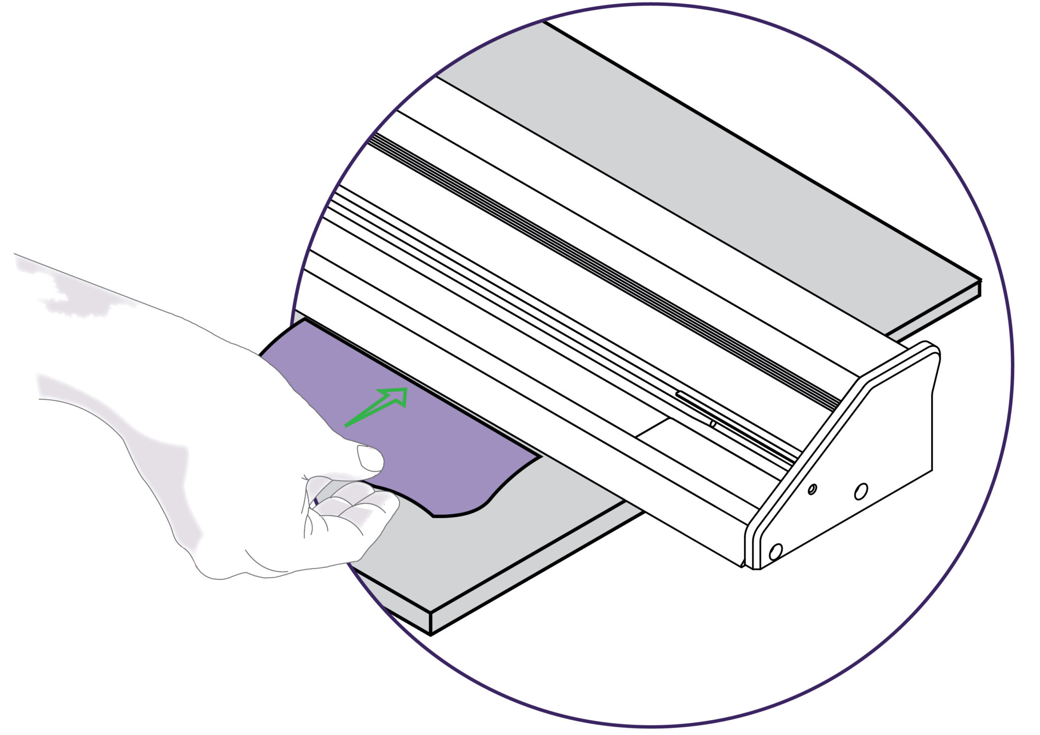 Lift and move one end of the cutter so the sightline strip (clear plastic strip running along cutting edge of the FreeHand) aligns with the cut line, then repeat at the other end. Look down vertically and check the sightline strip aligns with the cut line before making the cut.