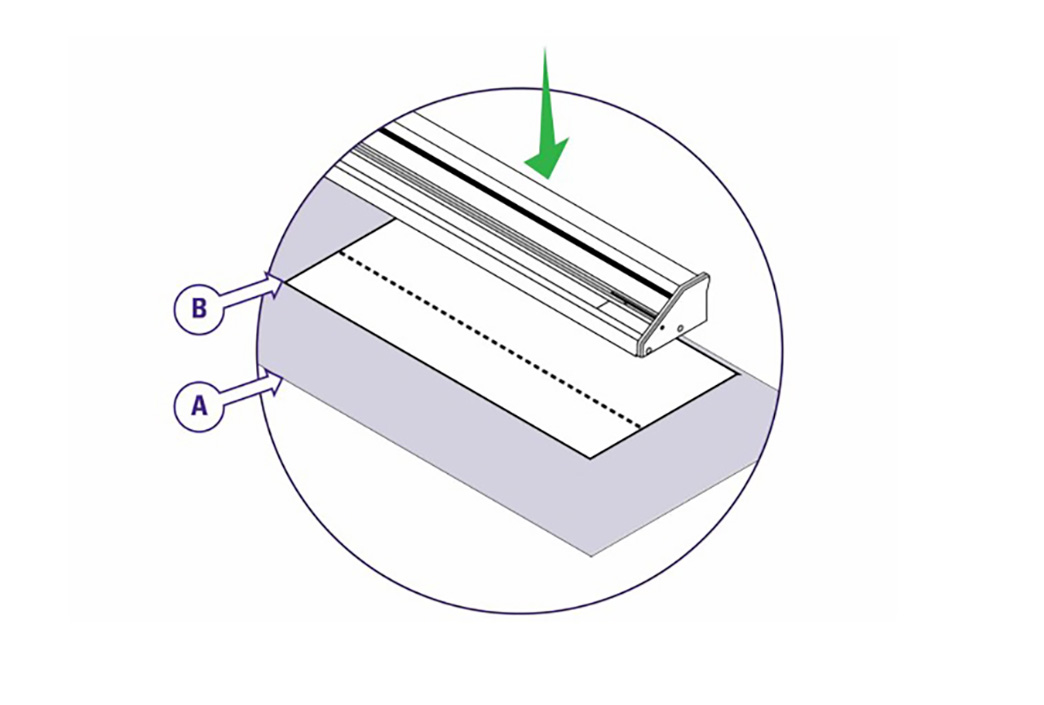 Place the cutting mat (A) on the work surface then the material to be cut (B) making sure the whole length of the cut line is over the cutting mat. Place the FreeHand on the material near to the cutline.