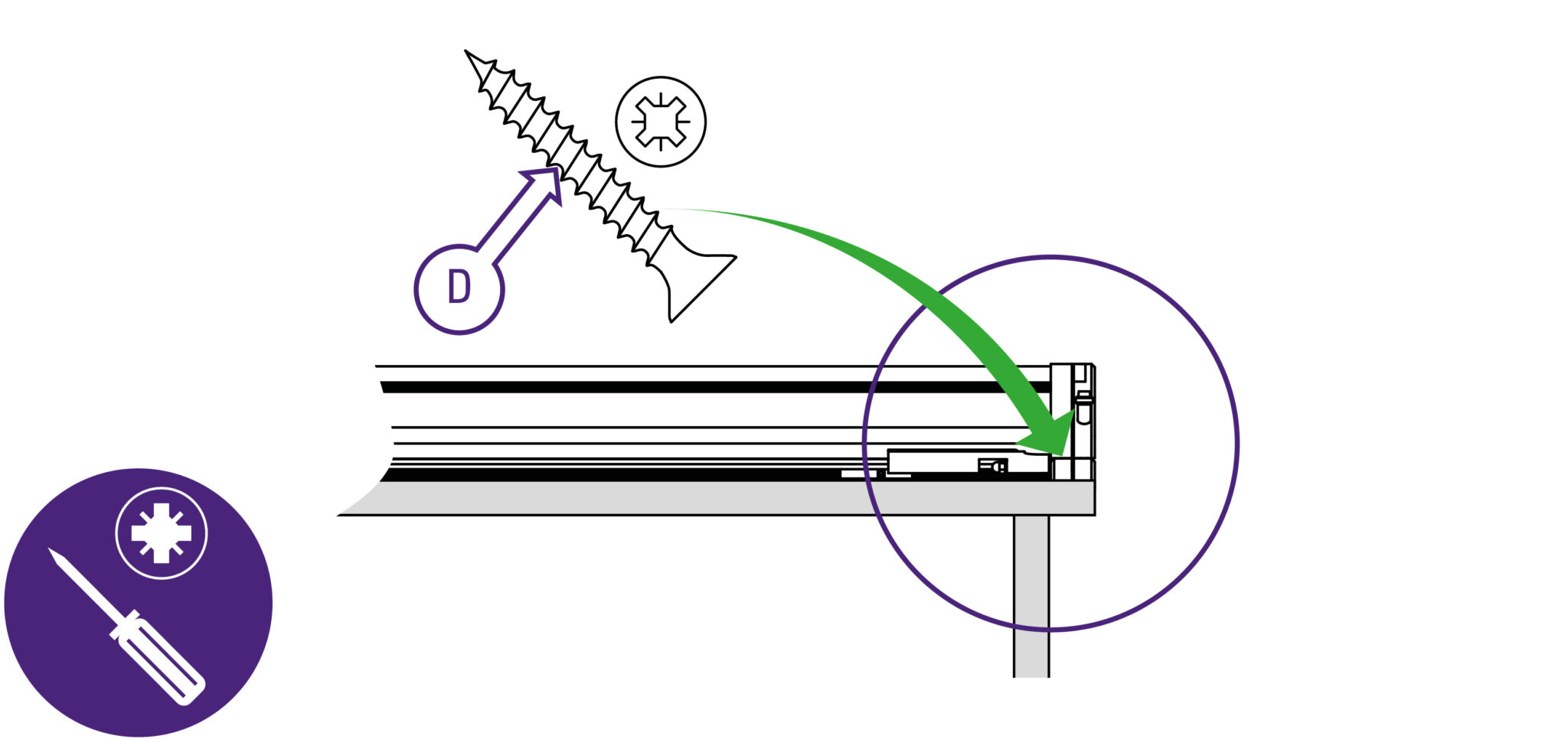 Using a Posi screwdriver (if fitting to custom made bench) or 3mm Allen (hex) key (if fitting to a SmartFold bench) fully tighten the vertical screws fixing the arm to the work surface (two at each end of the SmartFold).
