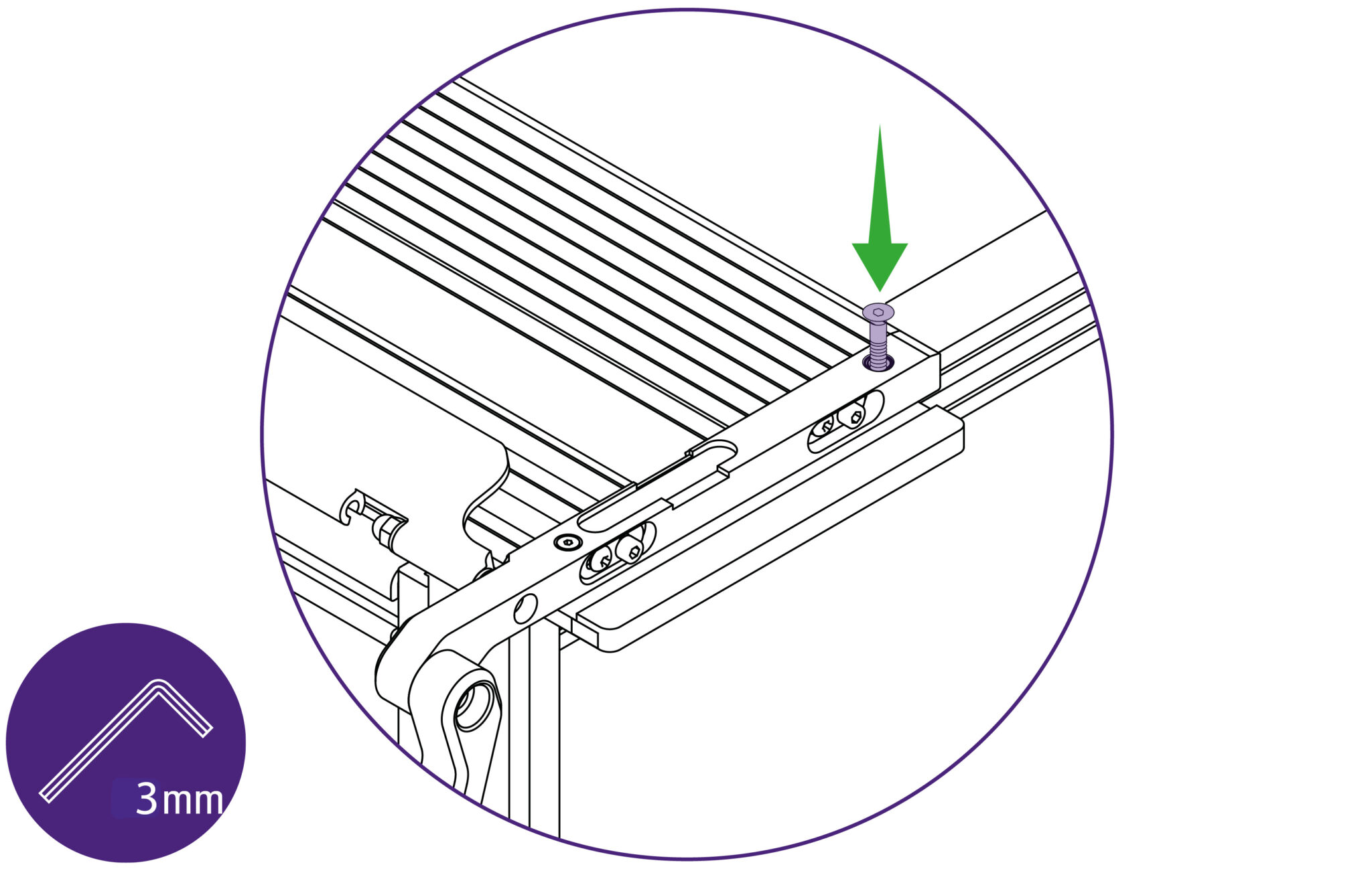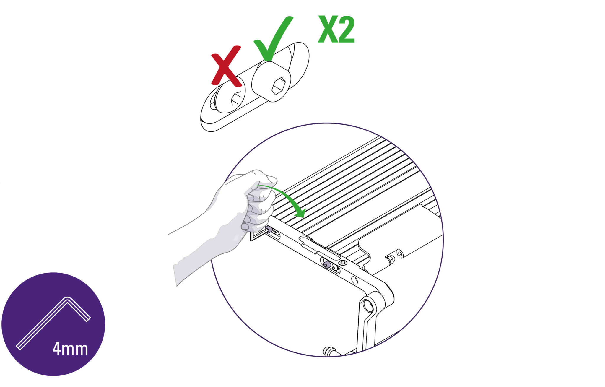 Use the long end of the 3mm Allen (hex) key rotate the grub screws in the front of the base brackets until you feel them come to a stop, do not tighten any further.