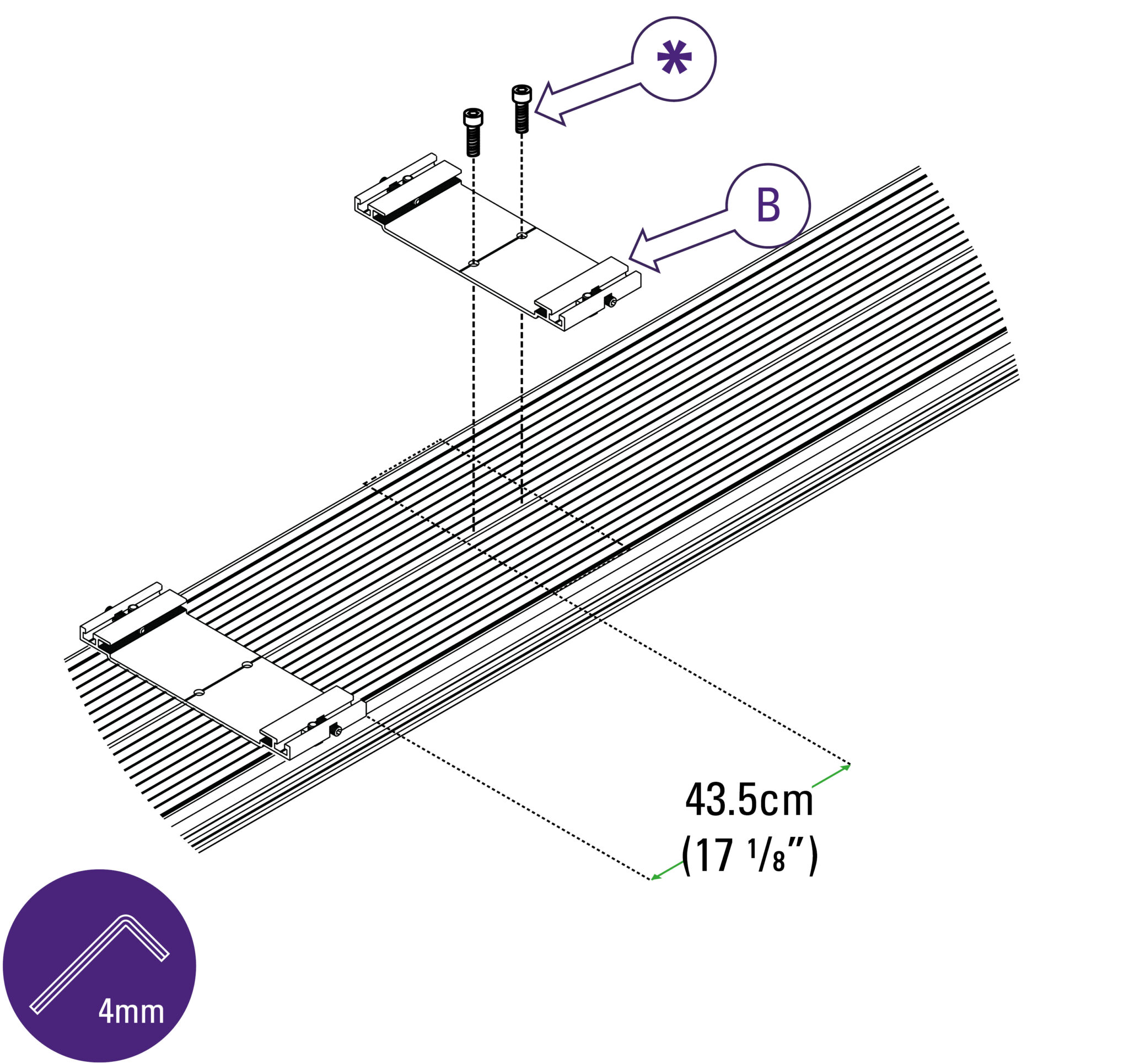 Place the following base brackets (part B) 43.5cm (17 ⅛”) from the edge of the previous base bracket. Use the 4mm Allen (hex) key to tighten screws (part *).